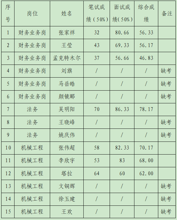 根據(jù)公司招聘方案工作安排,經(jīng)筆試、面試等環(huán)節(jié)綜合評(píng)定,現(xiàn)將招聘綜合成績(jī)?nèi)藛T名單予以公示,具體如下: